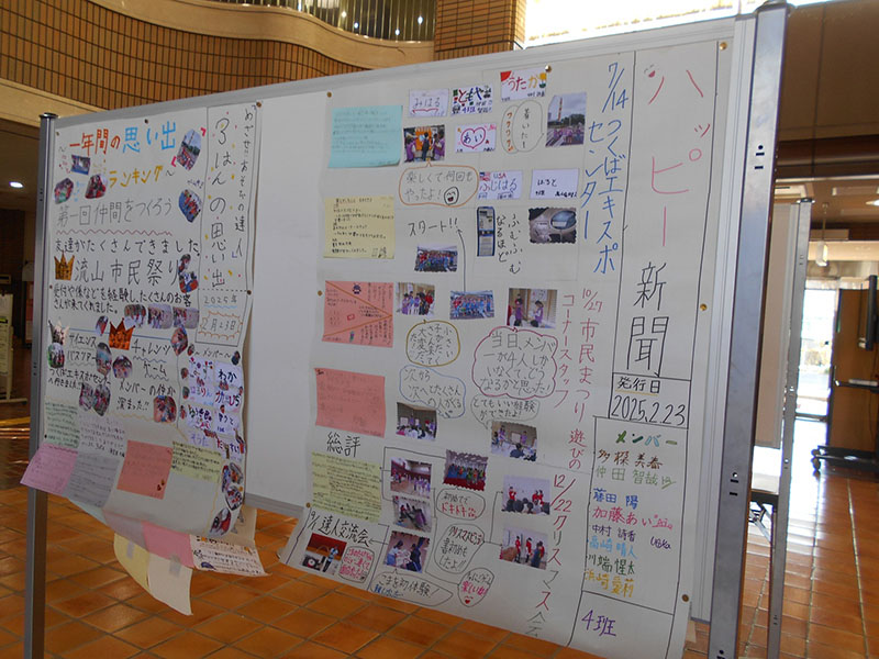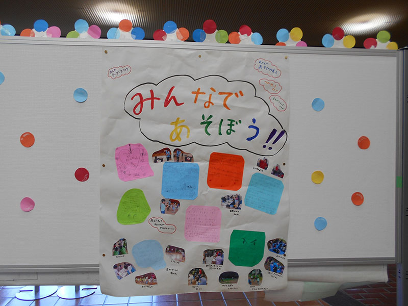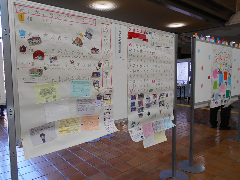 | 市子連活動報告、書き初め大会受賞作品、『めざせ!あそびの達人』の壁新聞・ジュニアリーダースクラブ活動・『みんなであそぼう』などの展示を行いました。毎年『めざせ!あそびの達人(年8回)では、最終回に一年間のまとめで、グループごとに、思い出など壁新聞作りを実施し、好評をいただいています。 |