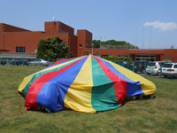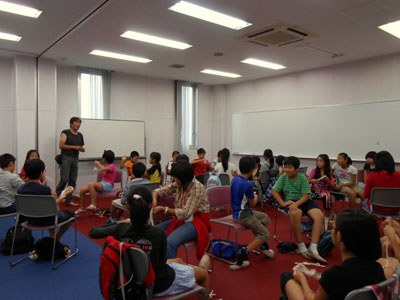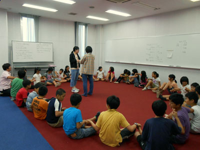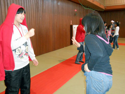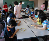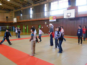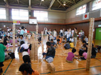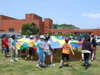 開講式後、講師の指導のもとに、いろいろなレクリエーションを楽しみました。とくに「新聞フライングディスク」が人気でした。これは自分たちで、新聞、テープなどを使って作り、芝生広場で飛ばしてあそびました。その他いろいろなゲーム、レクリエーションを学習して、楽しく過ごしました。
