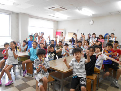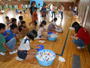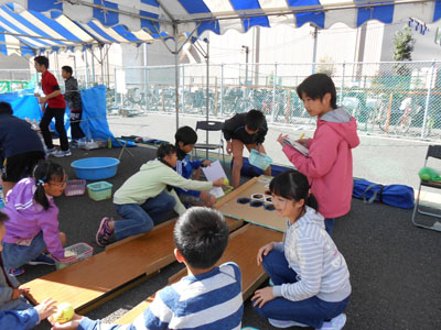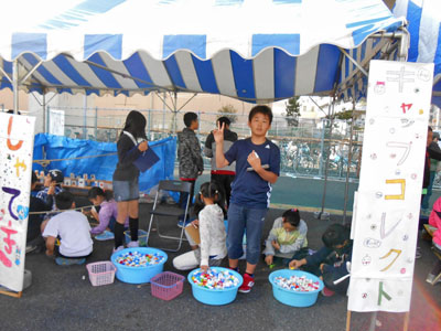 市子連のリーダースを中心に、射的のあそびコーナーを開店しました。リーダース手作りの割りばし鉄砲と的も手作りで、なんども挑戦している子もいて、子どもたちに人気でした。景品が無くなり、早仕舞いになりましたが、もっとやりたい人には、自由に体験してもらい、来場者167名ととてもにぎわいました。 |