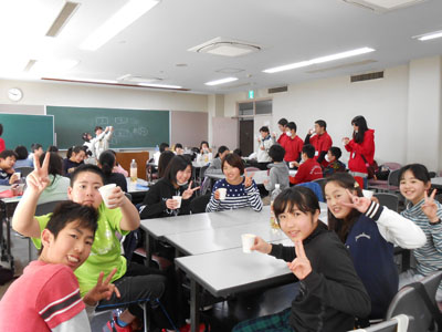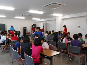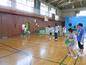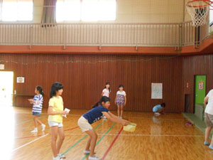 前回の事前活動をもとに、自分の担当コーナーで、あそびを教える側として、ジュニアリーダースの助言をもらいながら、小さい子にやさしくわかるように説明していました。終了後、疲れたなどと言いながらも達成感で満足顔の受講生でした。 |