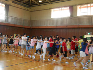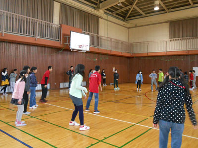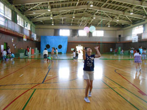 市子連主催の「チャレンジゲーム大会」を開催しました。森のまち子どもクラブ・ながれっ子クラブ・リーダース・あそびの達人などの、市子連会員96名が参加して、大学生のリーダースを中心に、6種類のゲームにチャレンジしました。まず始めに、リーダースによるいろいろなレクリエーション(レク)で身体を動かして、みんなであそびました。 |