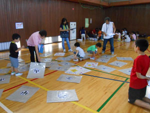 最後に長い一つの列になりジャンケンチャンピオンが決まり、笑い声がいっぱいでした。チャレンジゲームでは、6種類のゲームを、全員時間内にまわり終えて、各チャレンジゲームのチャンピオンを発表して盛り上がりました。幼児から、大学生、大人まで一緒にあそんだ楽しい2時間でした。 |