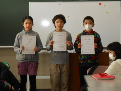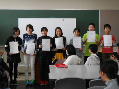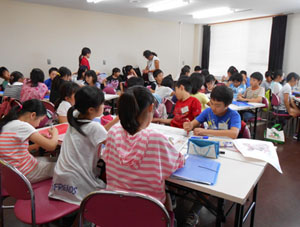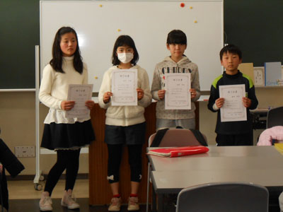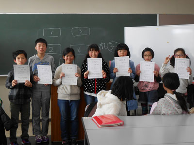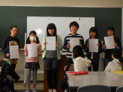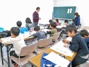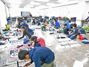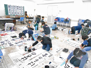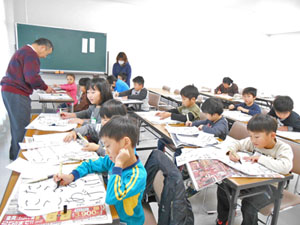 毛筆では、小筆を使って、名前を書くのが難しいようでしたが、子ども達は集中して真剣に頑張っていました。1・2年対象の硬筆では、特に1年生は初めての参加でしたが、お手本を見ながらフェルトペンを使って、上手に書いていました。この書初め大会では、学校の宿題も一緒にできるので、みんなに人気があります。