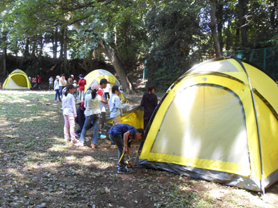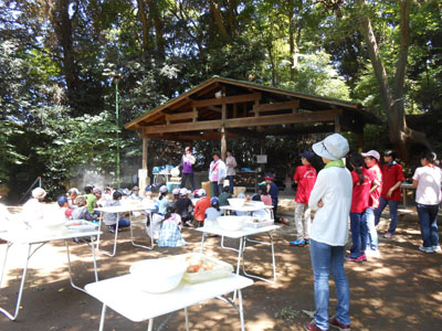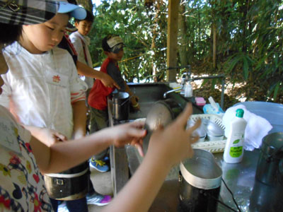 カレーライスの出来上がる間に、テント張りを体験しました。リーダースの指導のもとに、テントのしくみ、張り方などを学習して、みんなで力を合わせて、3張りのテントを張ることができました。午前の活動でおなかもすいて、自然の中で食べるカレーライスに「おいしーい!」と舌づつみ。