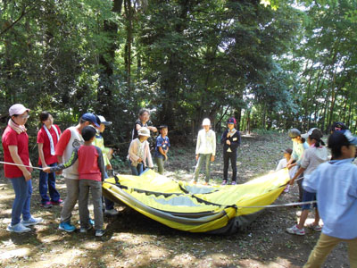 午後は、リーダースによる「レク」を楽しみ、テントの撤収でテントのたたみ方、しまい方を教えてもらいました。