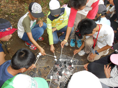 食後に、残り火を使って、割りばしにマシュマロをさして、焼きマシュマロを作り、ふっくらふくれて甘いマシュマロはとても人気でした。