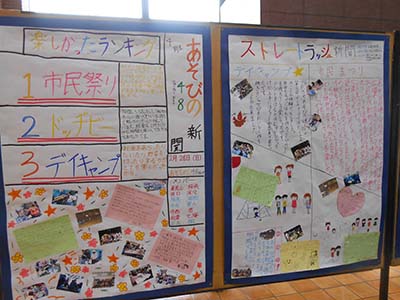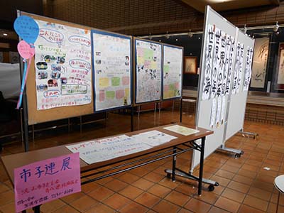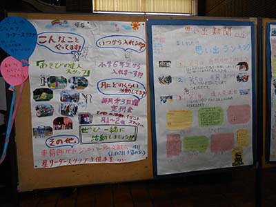 流山市子連活動報告及び『めざせ!あそびの達人』のカベ新聞、新春書初め大会の入選作品などの展示を行いました。