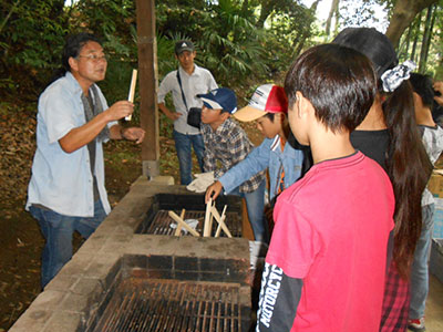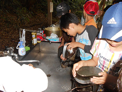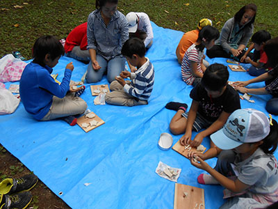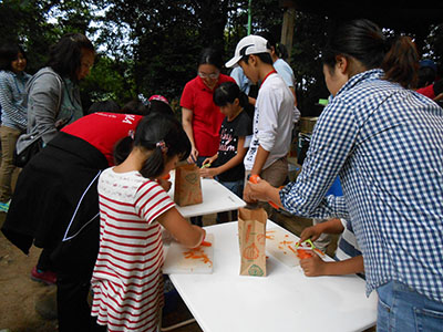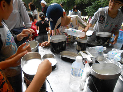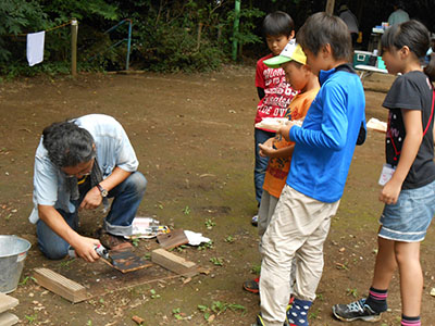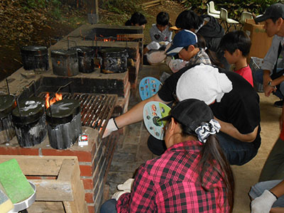 開村式後、カレーライスの準備からスタートで、飯ごう係・野菜係・かまど係と、子ども達のやりたい係に挑戦しました。飯ごう係では、リーダースからお米の分量、とぎ方、水かげんなどを教えてもらいました。野菜係は、皮むきはピューラを使って、野菜切りは、きき手に包丁を持って、野菜を押さえる手は「ねこの手だよ!」と教えてもらい、包丁を持つのは初めての子ども達も、頑張りました。そして、一番大変なかまど係の火おこしでは、まずまきの組み方の説明を受けて「新聞紙をまるめて、その上に小枝から組むんだね!」と目を輝かせながら、真剣に聞き入っていました。「火をつけるのは、マッチを使うよ!」とリーダースのお兄さんに言われて「えっ!チャッカマンじゃないの?」と驚き顔の子ども達。まきに火が移るように、うちわを使って少しずつ火を起こしていきました。カレーライスが出来上がるのを待つ間に、「焼き杉」のトライです。杉板の上に、油粘土を丸めたり、細長くのばして、名前やイニシャルも入れて、模様を作っていきました。それから粘土をつけた杉板をバーナーで焼いて粘土を落としてから、水の中で杉板をたわしでこすって洗い出来上がり!「思ったよりもうまくできた」「すごい!字がうきでたよ!」などと、みんなとてもうれしそうで、ステキなおみやげになりました。