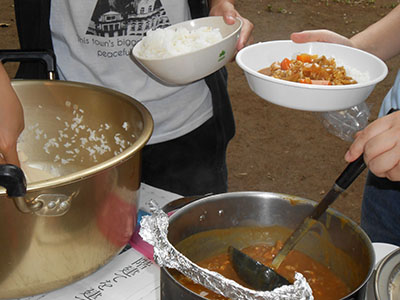 おなかもすいてきた頃、カレーライスも出来上がって、みんなでカレーライスをいただきました。焼きジャガイモに、焼きトウモロコシとミニトマトも甘くておいしかったね。デザートにスイカも食べて、みんなお腹一杯。