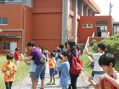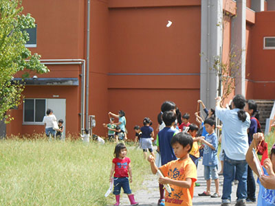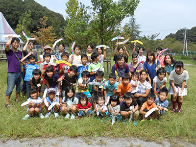 当日は、お天気も良く、外に出て、飛ばし方を習って、みんな本当にうれしそう!「とんだ!とんだ!」「すごーい、遠くまで行ったー」飛ばしすぎて木に引っかかったり、建物の上に乗り上げたりと、ハプニングもありましたが、少し折れかかっても、補正する方法も教わり、思いっきりみんなであそびました。最後にみんなで記念撮影!今日も楽しくあそんでよかったネ!次回もまたあそぼうね。 |