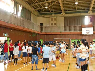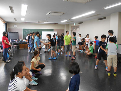 命令ゲーム(笛がなったら手をあげる)から始まり、一人のゲームから二人、三人と、そして、チーム対抗ゲームなどに発展して、楽しい時間を過ごしました。ジュニアリーダースのお兄さん・お姉さんも一緒にたくさんのレクを体験しました。午後は、グループワークで、グループごとに、自己紹介、キャンプネーム(自分がみんなから呼んでもらいたい名前)作りをしました。第1回の講習ではレク・グループワークなどを通して、初めて会う友達とのコミュニケーションをテーマに活動しました。 |