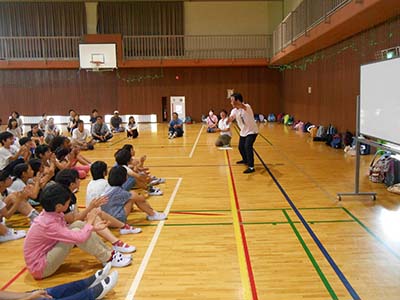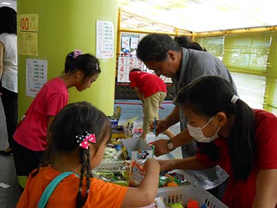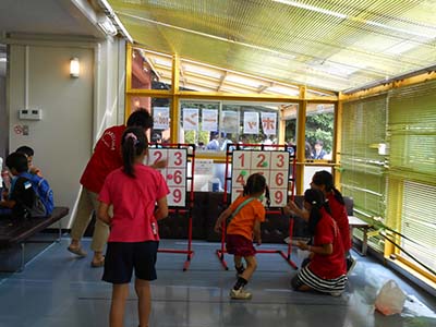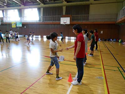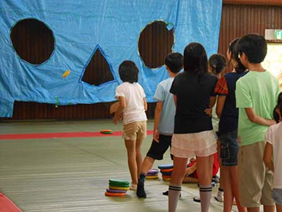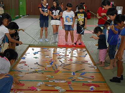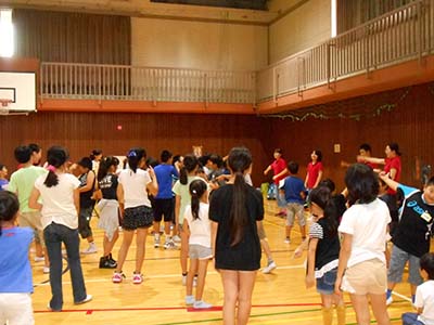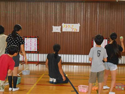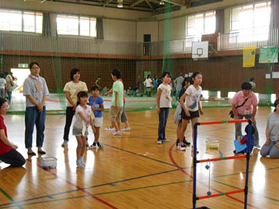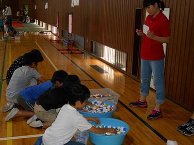 6つのゲームコーナーで、チャレンジ後、ジュニアリーダースのお兄さん、お姉さんに自分のカードに点数を記入してもらいました。低学年は、お父さん、お母さんと一緒にチャレンジゲームを楽しみ、魚つりや、キャップコレクトなどが人気でした。高学年は、フリスビーターゲット、ラダーゲッターに何度もチャレンジしていました。低学年から高学年までが一緒に遊ぶことにより、同学年とは異なる、たてのつながりができました。最後に、ジュニアリーダースのお兄さん、お姉さんによるレクリエーション(レク)で盛り上がり、子どもから大人まで、楽しいひとときでした。